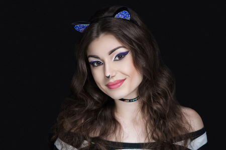 女性の美しい明るい派手な少女モデル セクシーな猫 おとぎ話の未来パーティー コスプレ クラブ 新しいメイク完璧な顔濃い目頬眉毛猫唇 顔のマスクは 爪を傷ボリューム出血 の写真素材 画像素材 Image